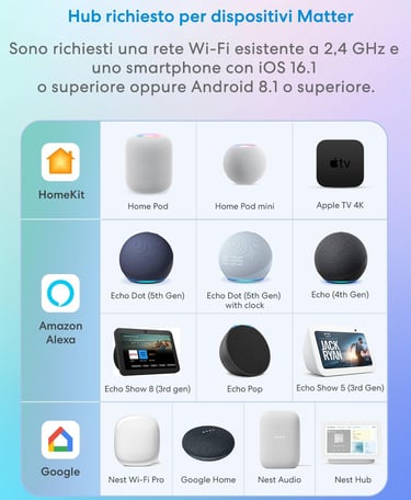Non devi più scegliere tra Apple, Google o Alexa. Matter è lo standard universale: se domani cambi telefono o assistente vocale, la tua presa continuerà a funzionare senza dover configurare nulla da capo.