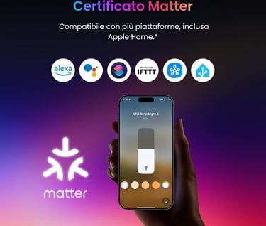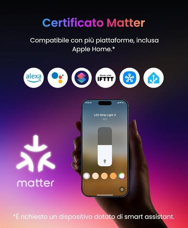 Dimentica di doverti alzare per cambiare colore. Gestisci tutto tramite App, telecomando IR incluso, o con la voce grazie alla piena compatibilità con Alexa, Google Home e Siri. Puoi anche impostare scenari automatici (es. "Ehi Siri, modalità Cinema").
